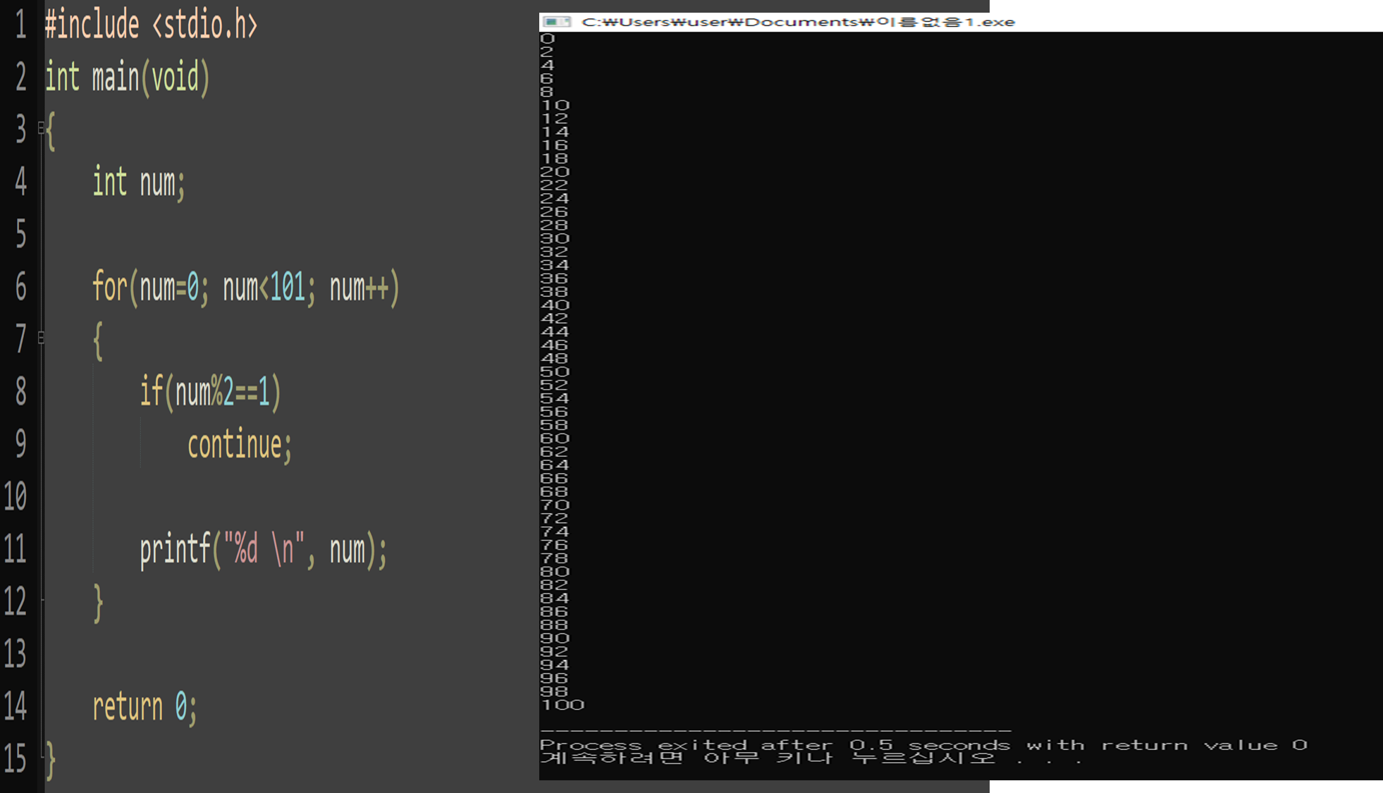 8행부터 11행까지에서 num%2가 1인 경우, 즉 num이 홀수인 경우 continue 문이 수행됩니다. continue 문이 수행되면 11행은 생략되고 6행의 num++을 수행합니다. 그런 다음 for 문이 반복됩니다. C언어에서는 이처럼 반복문을 탈출하고 생략하는 break continue라는 키워드를 제공합니다.
